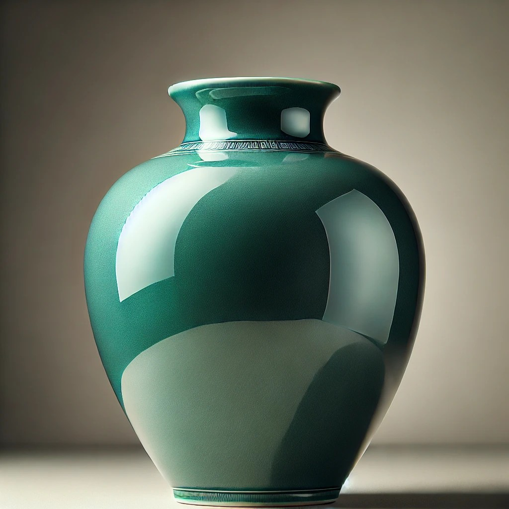 «Un jarrón de cerámica esmaltada, brillante y de color verde jade, con reflejos de luz natural en su superficie.»