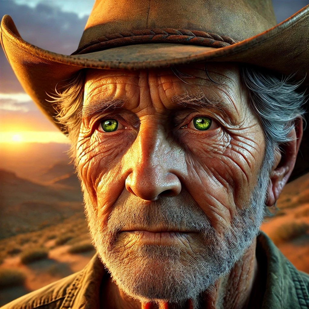 «Un retrato hiperrealista de un hombre mayor con sombrero de vaquero, piel curtida por el sol, ojos verdes llenos de vida, en un paisaje desértico bajo la luz dorada del atardecer.»