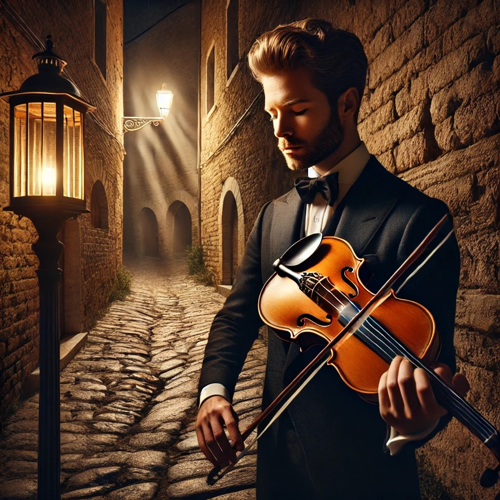 «Un retrato de un violinista en un callejón empedrado, iluminado por un farol de gas, con sombras largas que se extienden por las paredes.»