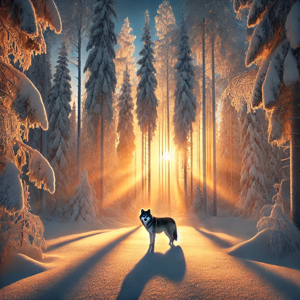 «Un bosque nevado al amanecer, con árboles altos cubiertos de nieve, rayos de luz atravesando las ramas y un lobo solitario parado en el centro, respirando vapor en el aire frío.»