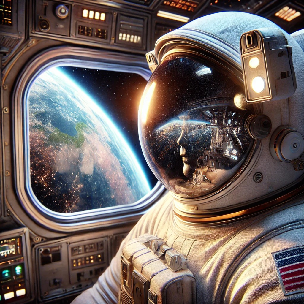 «Un astronauta mirando la Tierra desde la ventana de una nave espacial, con reflejos de estrellas en el cristal del casco y una expresión de asombro.»