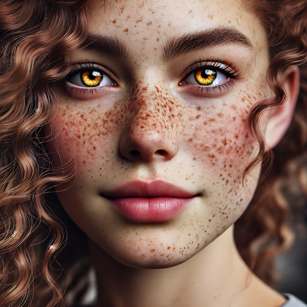 «Un retrato hiperrealista de una mujer joven, con pecas visibles y ojos color miel, con cabello rizado al viento.»