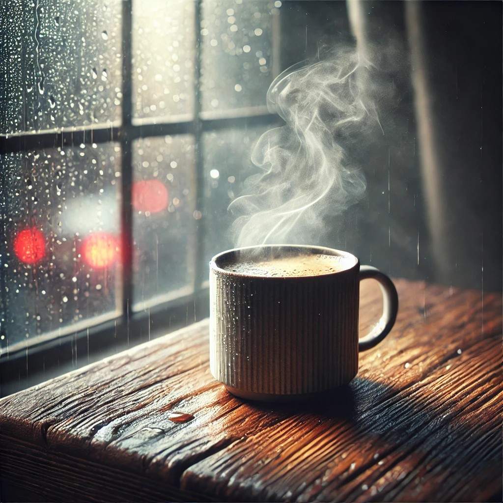 «Un primer plano de una taza de café humeante en una mesa de madera envejecida, con el fondo desenfocado mostrando una ventana lluviosa.»