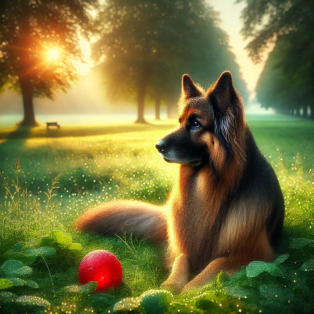 - Específico: «Un pastor alemán de pelo largo, sentado en un parque verde al amanecer, con gotas de rocío en el césped y una bola roja junto a sus patas.»